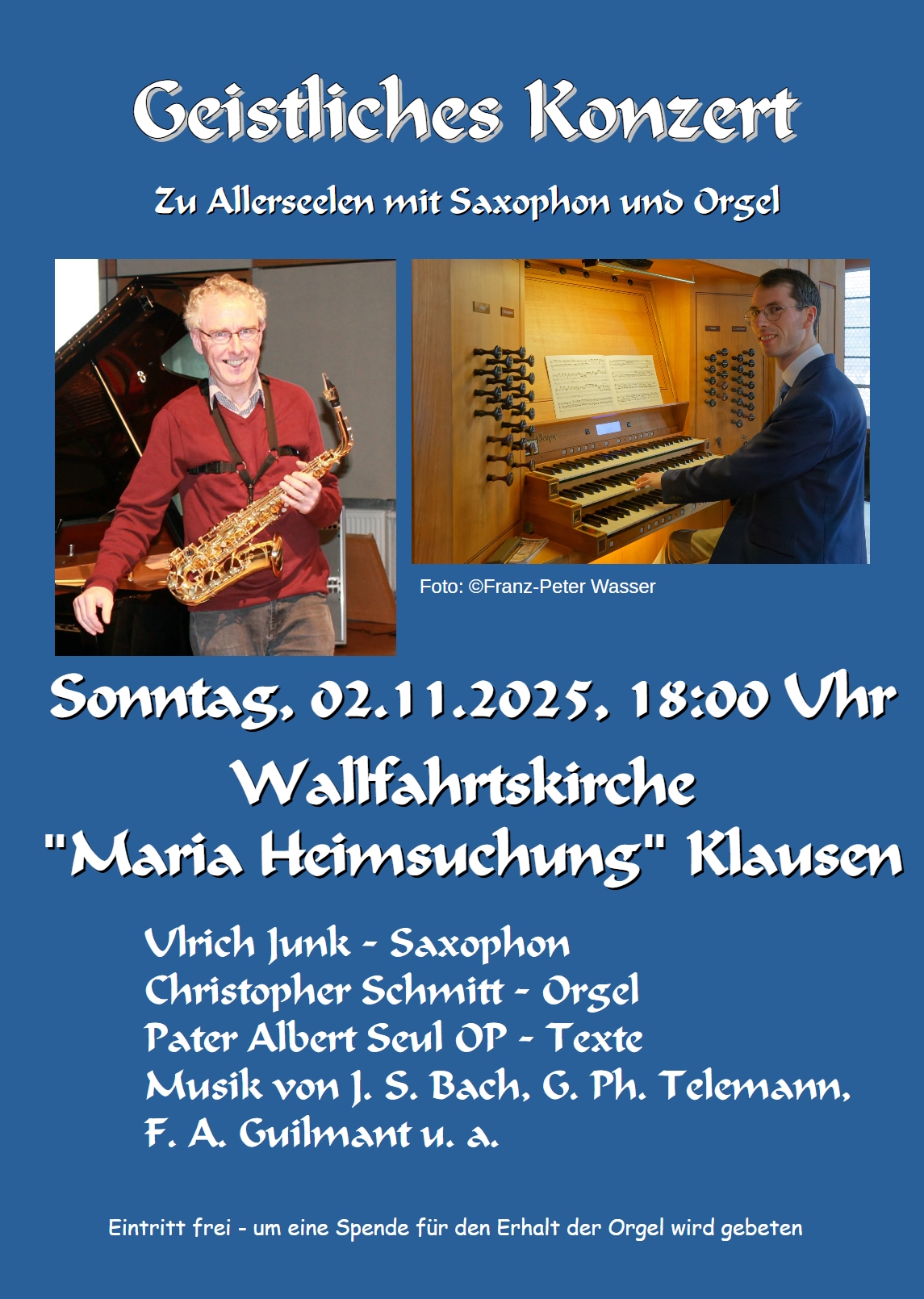 Ulrich Junk spielt Saxophon und Klarinette, Christopher Schmitt begleitet an der Orgel und Pater Albert Seul OP liest passende Texte.