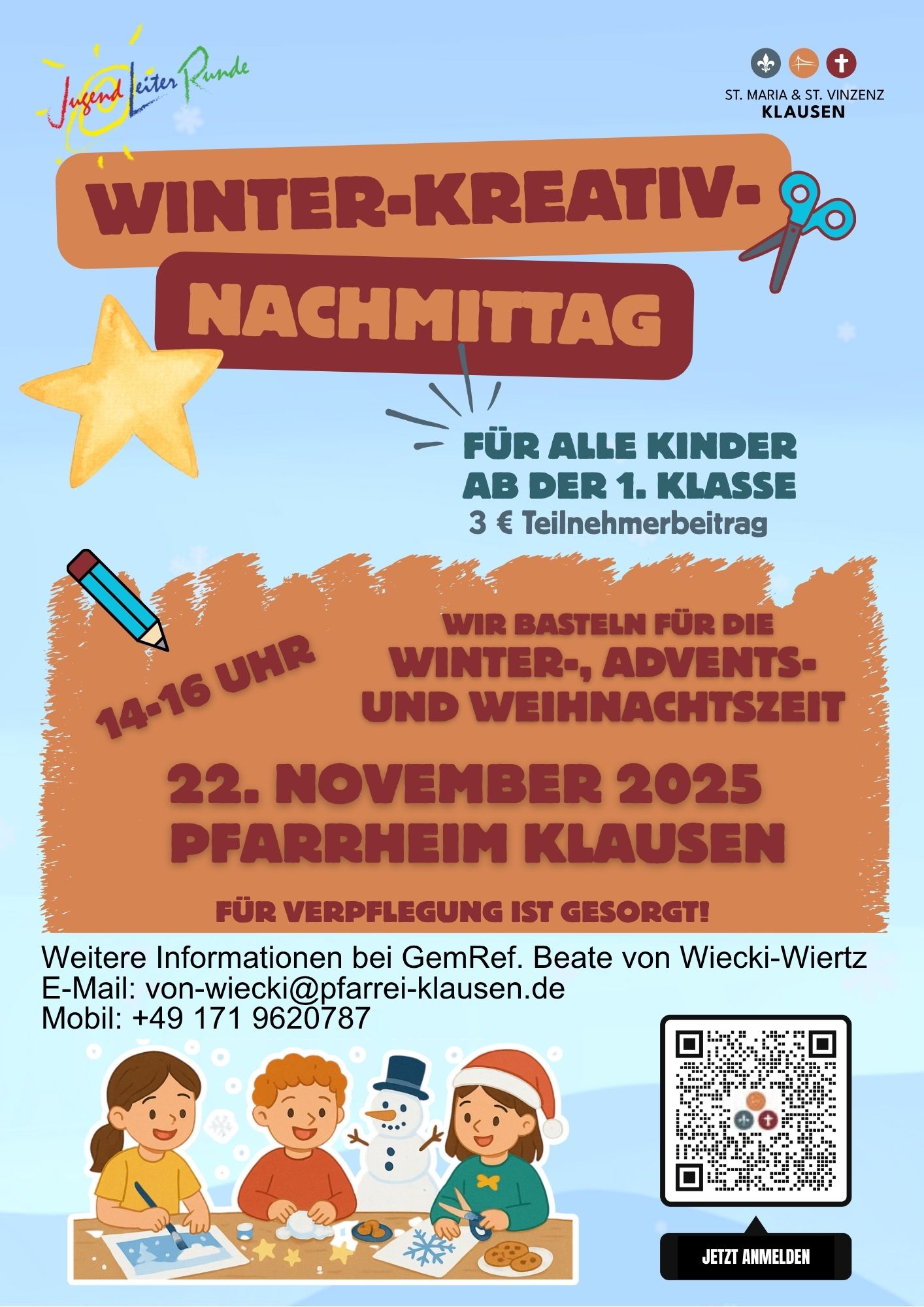 Die Jugendleiterrunde der Pfarrei Klausen lädt Kinder ab der 1. Klasse ein zum Winterkreativnachmittag.