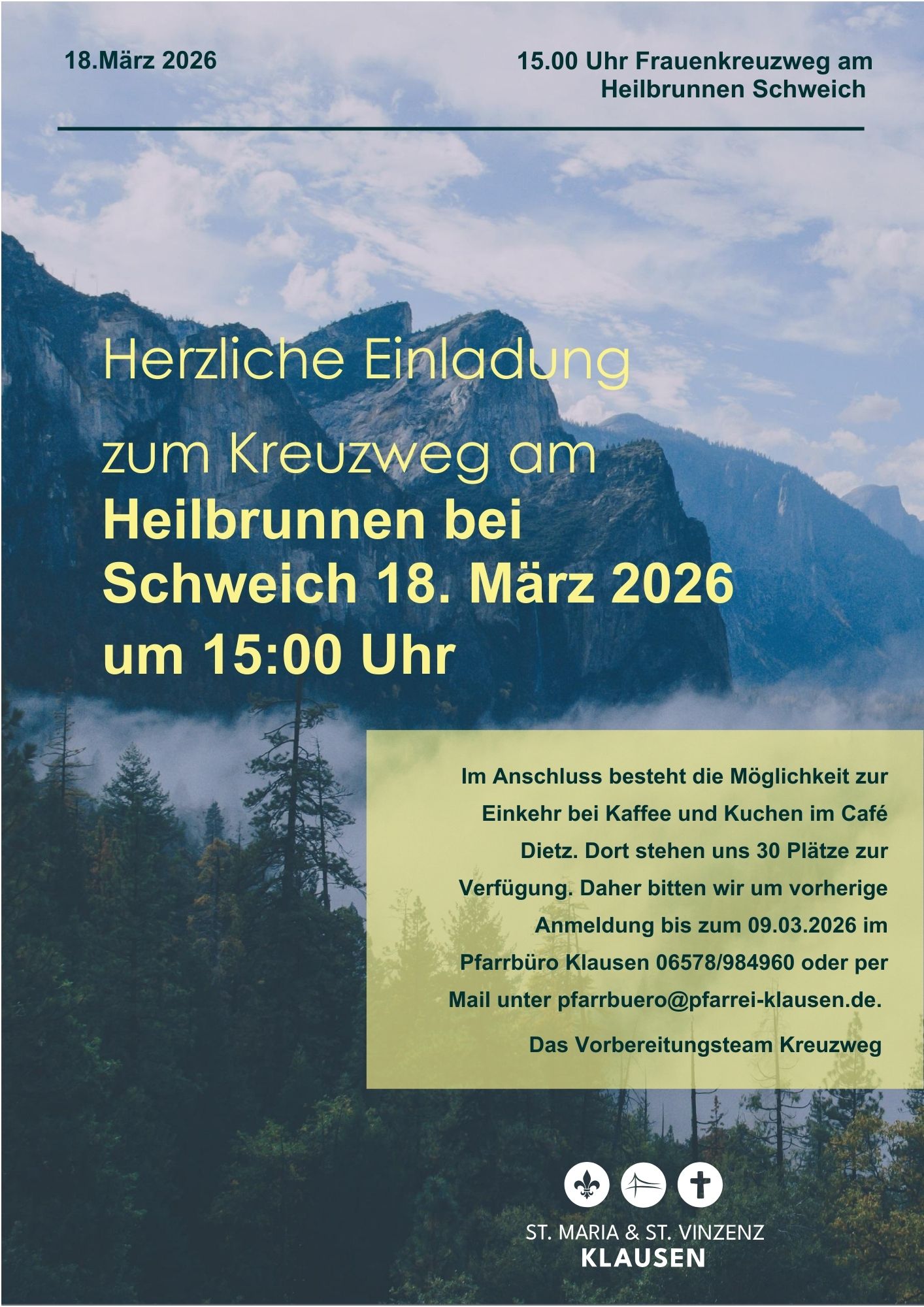 Im Anschluss besteht die Möglichkeit zur Einkehr bei Kaffee und Kuchen im Café Dietz. Dort stehen uns 30 Plätze zur Verfügung. Daher bitten wir um vorherige Anmeldung bis zum 09.03.2026 im Pfarrbüro Klausen 06578/984960, per Mail unter pfarrbuero@pfarrei-klausen.de oder über den unten stehenden Link.