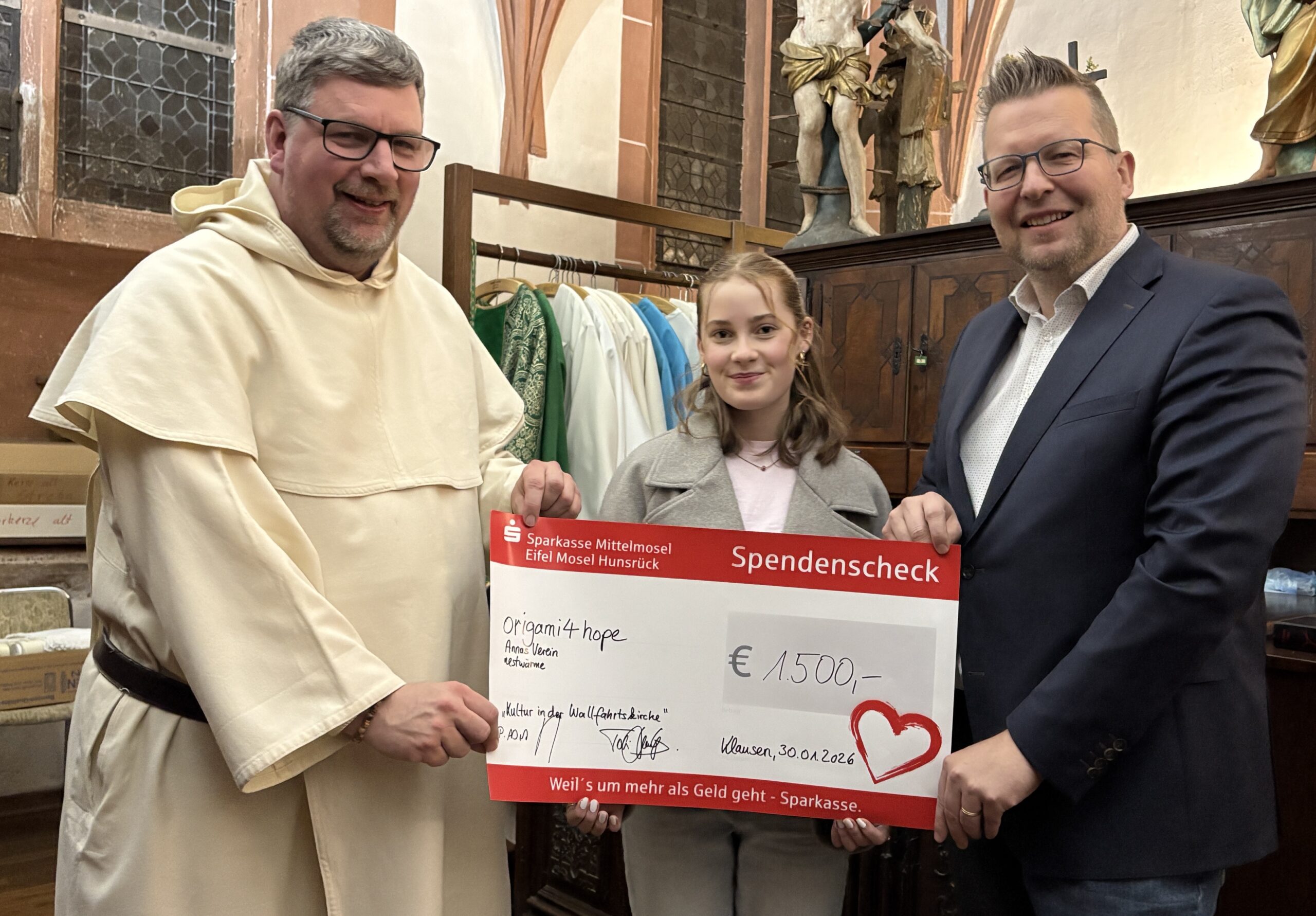 Klausen. Im Rahmen der Veranstaltungsreihe „Kultur in der Wallfahrtskirche“ wurde am Freitag, durch Pater Albert Seul OP und Kulturmanager Tobias Marenberg, ein Scheck über 1.500 Euro an die gemeinnützige Initiative origami4hope übergeben. Die Summe stammt aus freiwilligen Spenden für Getränke bei dem Mitsingformat „Just SING“ und wurde von Besucherinnen und Besuchern mit sehr viel Großzügigkeit unterstützt.