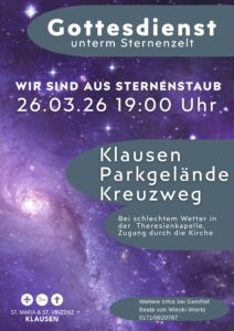 Am 26.03.26 um 19:00 Uhr sind alle Interessierten, besonders unsere Firmlinge, zu einem Gottesdienst im Freien „Unter dem Sternenzelt“ in den Park nach Klausen eingeladen. Wir wollen gemeinsam die Weite der Schöpfung Gottes erspüren und uns davon berühren lassen. Sterne erzählen uns in der Bibel von Gottes Herrlichkeit und Größe. Sie können uns zum Symbol für Orientierung und zum Wegweiser in der Dunkelheit werden.