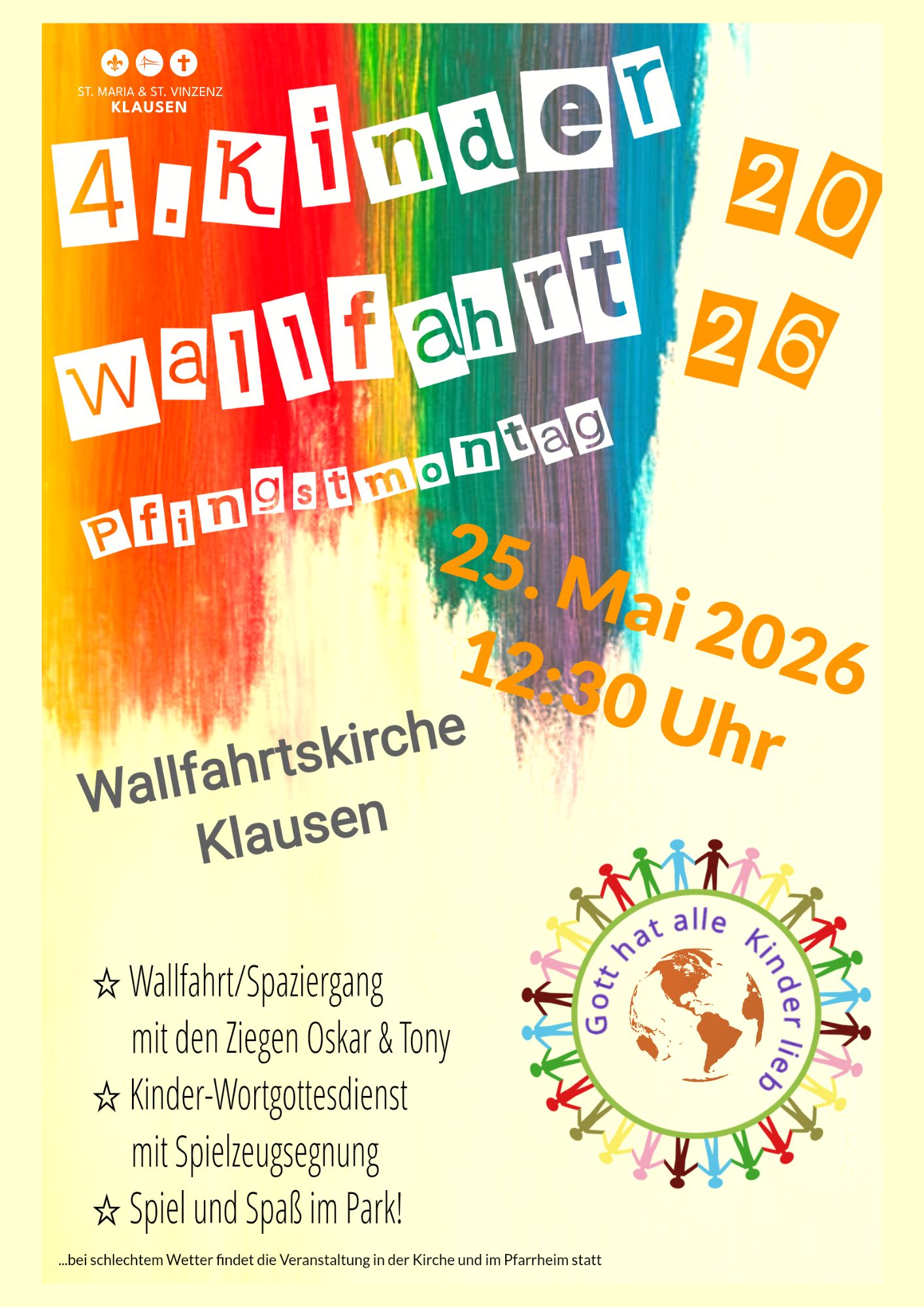 Am 25.05.26 (Pfingstmontag) findet wieder die Kinderwallfahrt für die Kinder unserer Pfarrei und darüber hinaus statt.