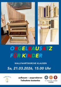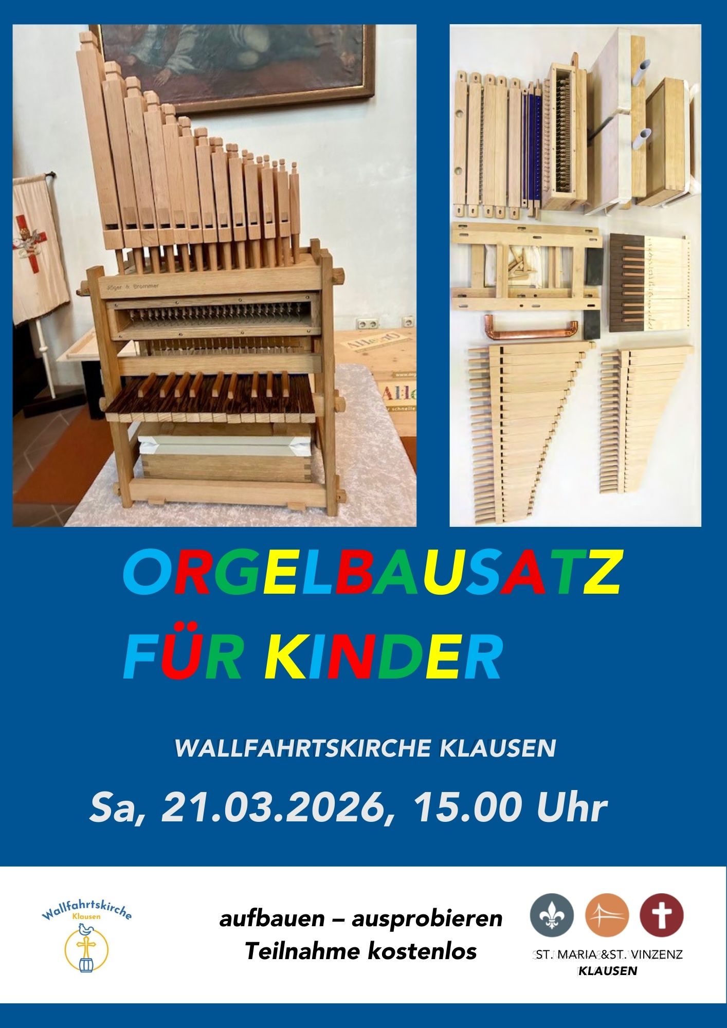 Am Samstag, 21.03.2026 um 15.00 Uhr haben Kinder die Möglichkeit, in der Wallfahrtskirche Klausen eine kleine Orgel aufzubauen. Es handelt sich um einen speziell für Kinder entwickelten Orgelbausatz, der vom Bistum Trier kostenlos zur Verfügung gestellt wird. Christopher Schmitt erklärt die einzelnen Teile, die zu einer Orgel gehören. Am Ende können die Kinder auf dem fertig zusammengebauten Instrument selbst spielen. Der Aufbau dauert etwa eineinhalb Stunden. Die Teilnahme ist kostenlos, eine Anmeldung ist nicht erforderlich.