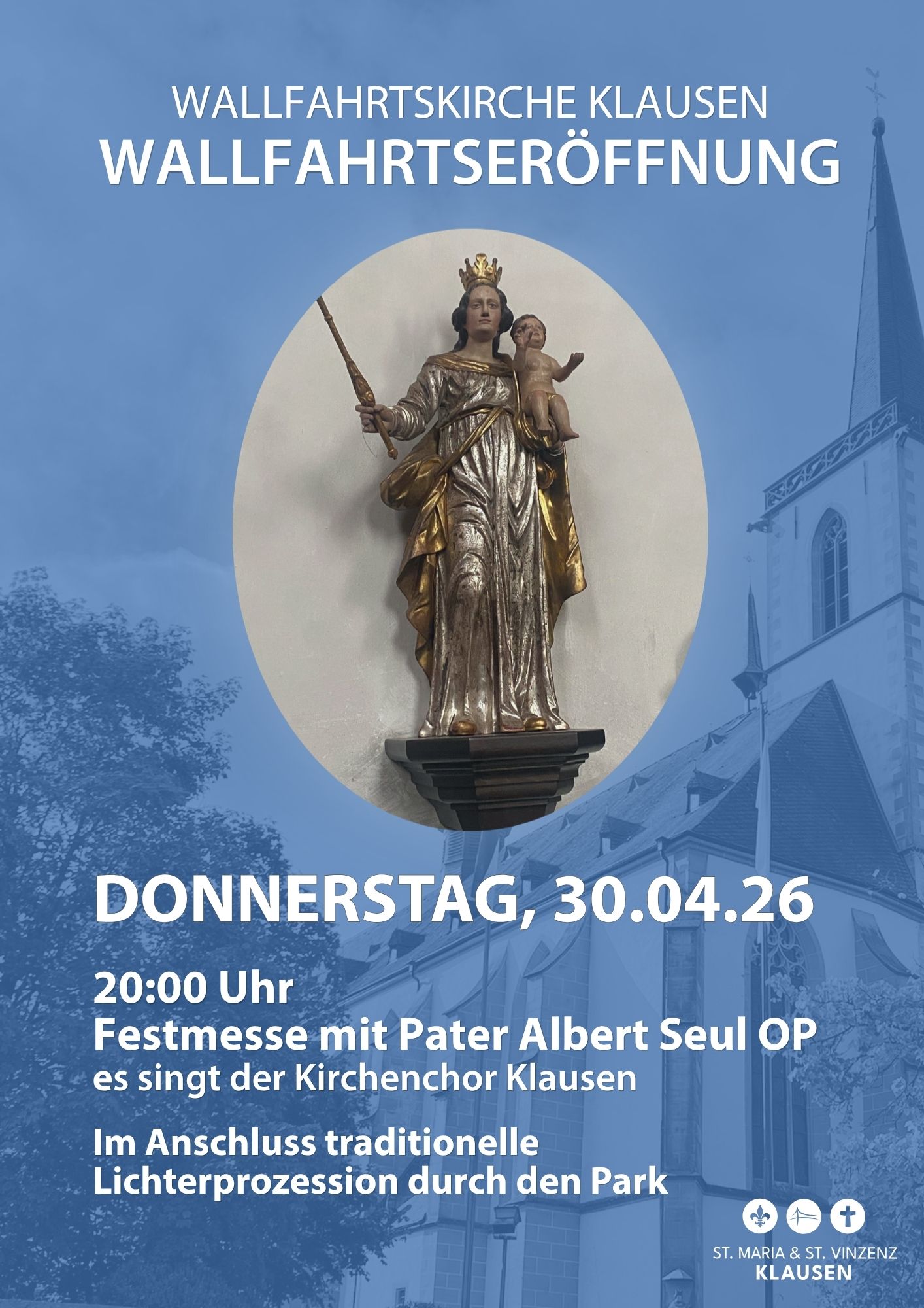 Am Donnerstag, 30.04.26 wird um 20:00 Uhr in Klausen die Marienwallfahrt mit einer Festmesse in der Wallfahrtskirche Klausen mit Pater Albert Seul O.P. und Diakon Andreas Maria Baumeister eröffnet. Der Kirchenchor Klausen singt im Gottesdienst. Es schließt sich die traditionelle Lichterprozession durch den Park an, die vom Musikverein Klausen mit Marienliedern begleitet wird.