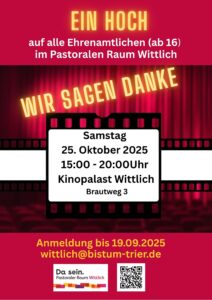 Dieses bunte, vielfältige, freiwillige ehrenamtliche Engagement will der Pastorale Raum Wittlich würdigen und lädt ALLE im Pastoralen Raum und in den Kirchengemeinden und an seinen Orten von Kirche engagierten Ehrenamtlichen herzlich zu einem Dankeschön-Event ein.